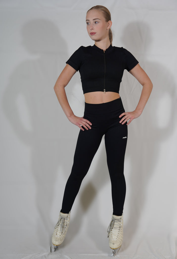 Parce qu’il donne un vrai style. Zippé et fermé, il trace une ligne nette, dessine la silhouette et met en valeur les formes sans rigidité. Les manches courtes couvrent juste ce qu’il faut ; la maille sans coutures épouse le corps et s’oublie pendant l’effort.