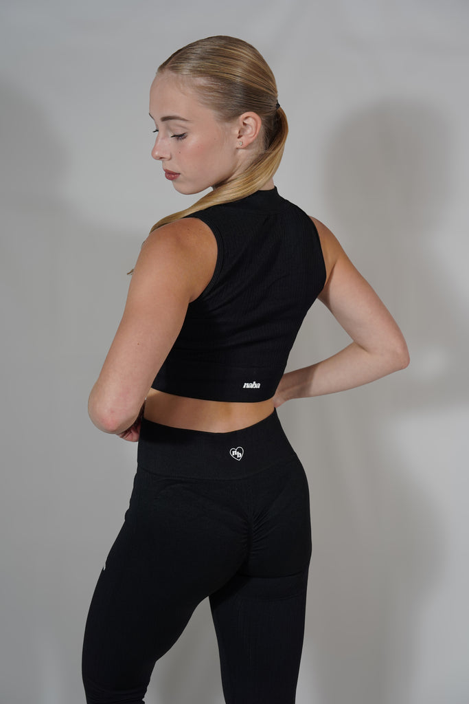 Sculpter, lisser, bouger. Ce top sans manches enveloppe le buste d’une maille seamless (sans coutures) qui répartit la compression de façon régulière : aucun frottement, aucune marque, juste une tenue propre qui accompagne chaque geste. Les épaules sont totalement libres, la ligne reste nette quand l’intensité monte. Tu l’enfiles, tout se met en place.